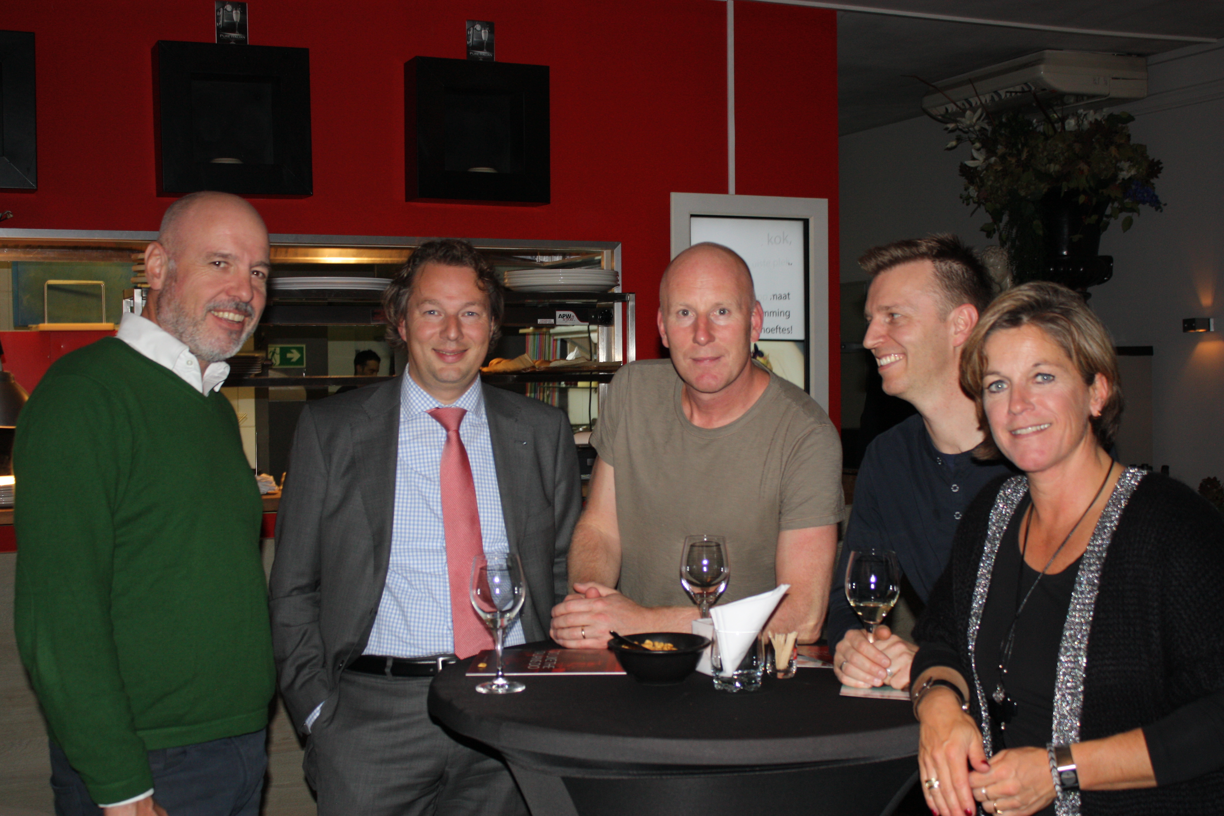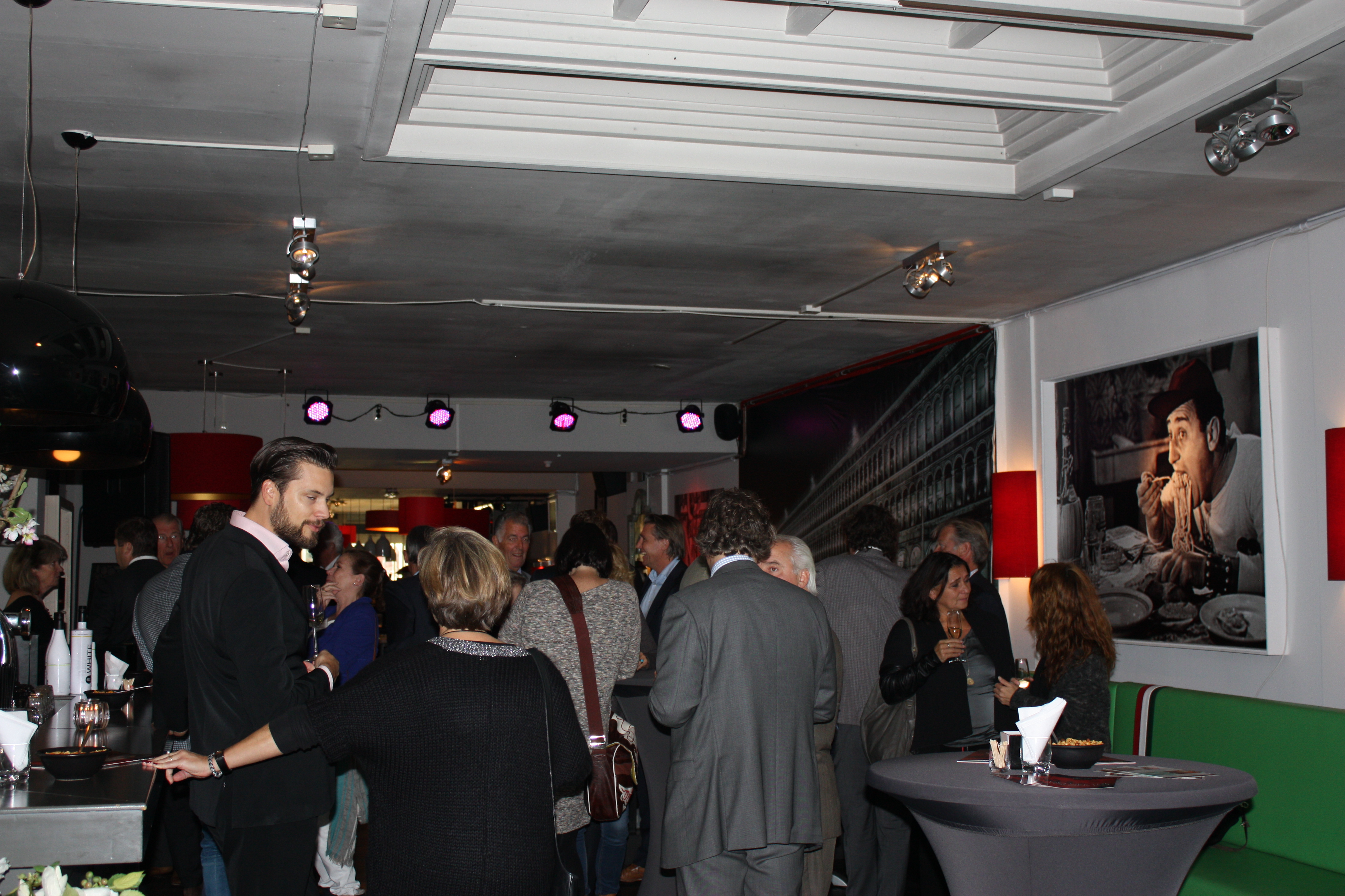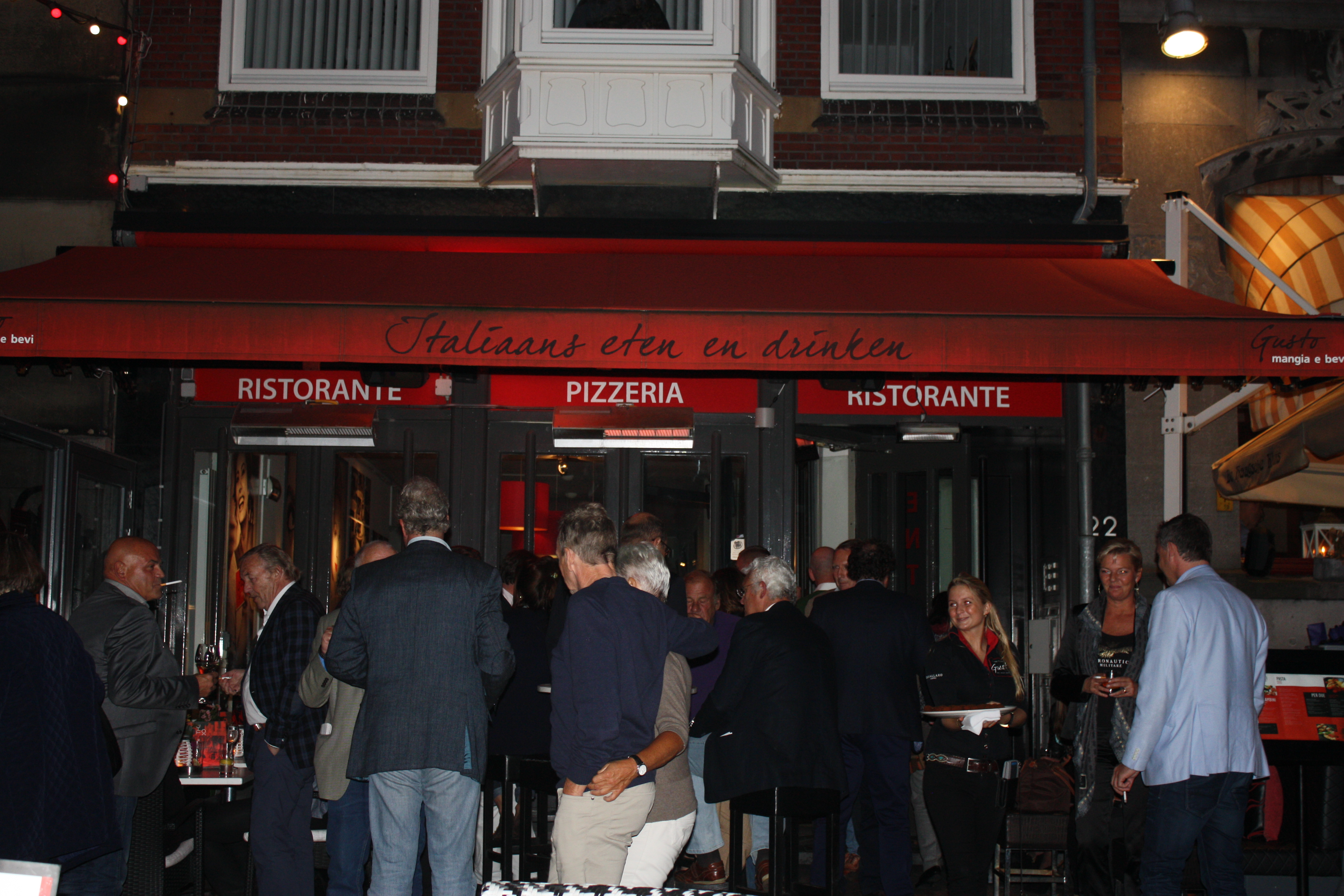 Zowel binnen als buiten wordt er hard genetwerkt en genoten van heerlijke Italiaanse wijnen. De fotograaf loopt rond en iedereen poseert gracieus en slaat spontaan de armen om degene die ernaast staat. Het personeel van Gusto blijft met een glimlach de groep verblijden met warme hapjes. Op advies van de wijnsommelier geniet iedereen van karakteristieke wijnen, maar er worden vooral business kaarten uitgewisseld en bijgepraat over de nieuwste ontwikkelingen binnen het ondernemerschap van de regio Haaglanden. Rob Truijens, directeur Business Haaglanden en Business Amsterdam, bedankt iedereen voor hun komst en herinnert de genodigden dat de Business Beurs Haaglanden binnenkort plaatsvindt in het Kyocera stadion, op 13 november. Na dit intermezzo wisselen de borrelaars van gesprekspartner en drankjes en hervatten de aanwezigen de conversaties en blijft het nog lang gezellig. De meeste gasten blijven na de borrel dineren bij Gusto en zetten de Italiaanse stijl voort.